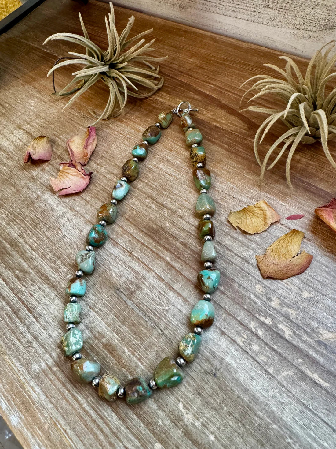 This 18-inch necklace is handmade by us in North Texas, featuring chunky turquoise nuggetsspaced with 5mm sterling silver pearls for that bold, raw, and elevated look.