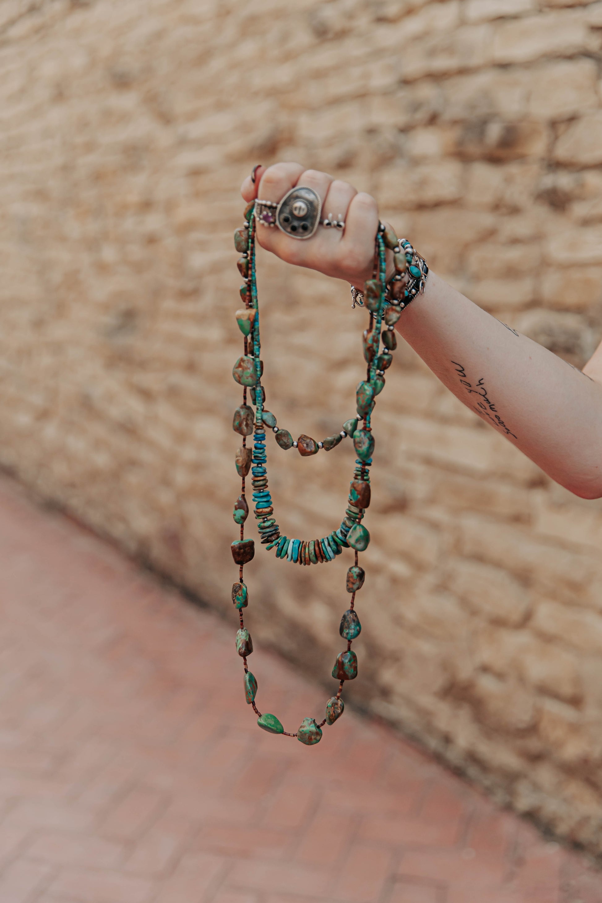 This 34-inch necklace is handmade by us in North Texas, featuring 3mm natural brown shell beadspaired with long, earthy turquoise nuggets in rich tones of green and brown.