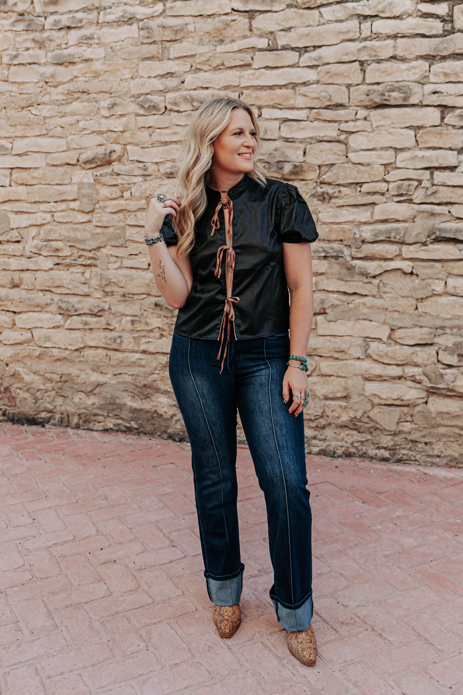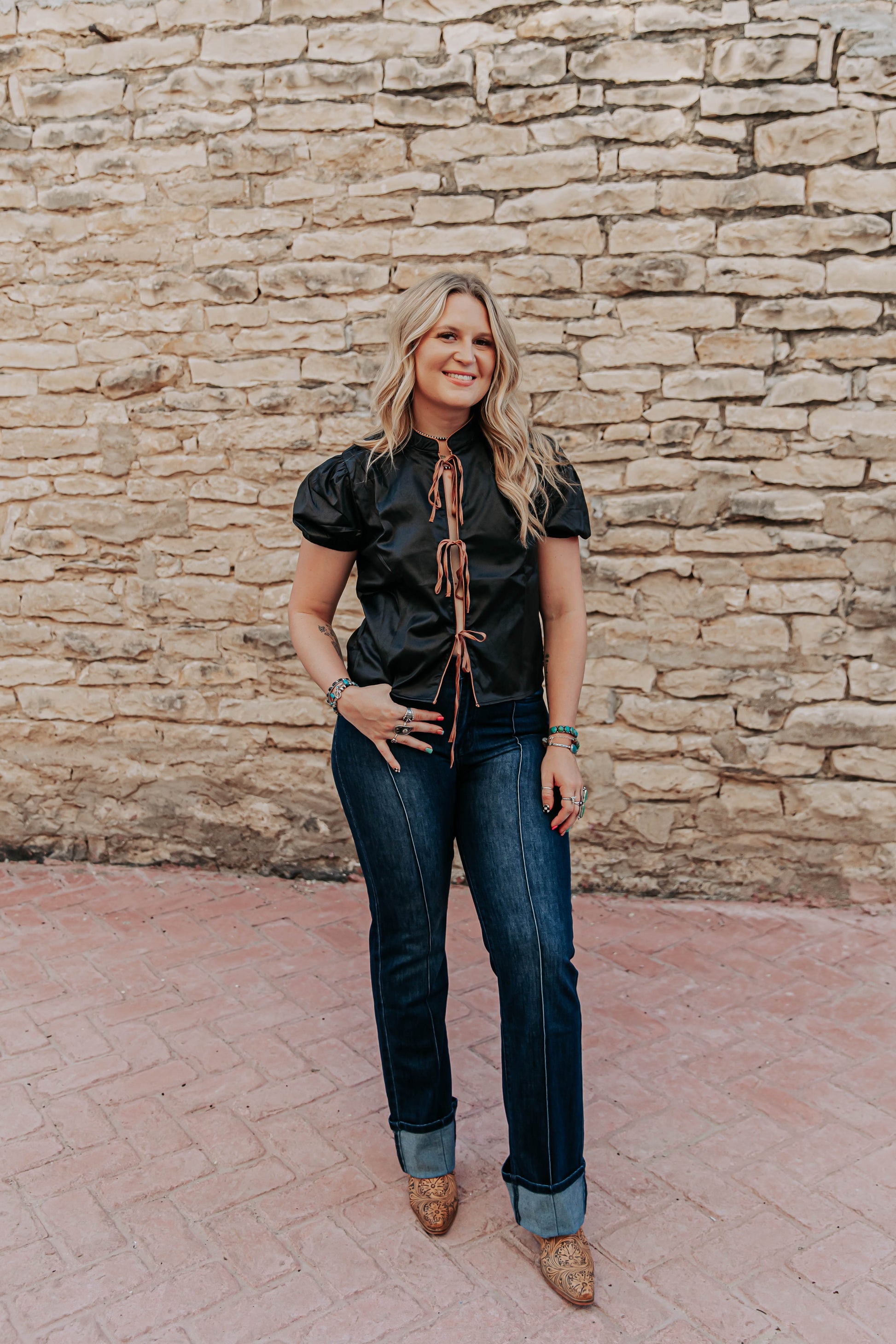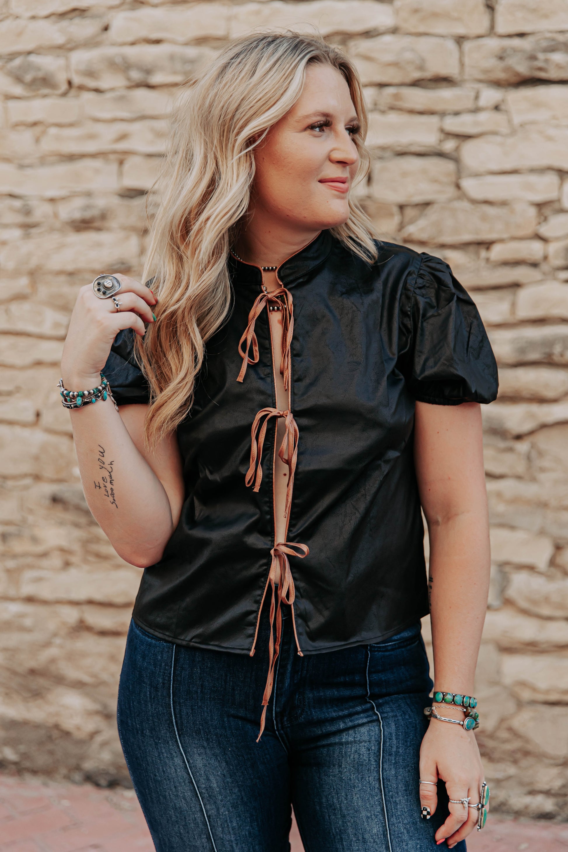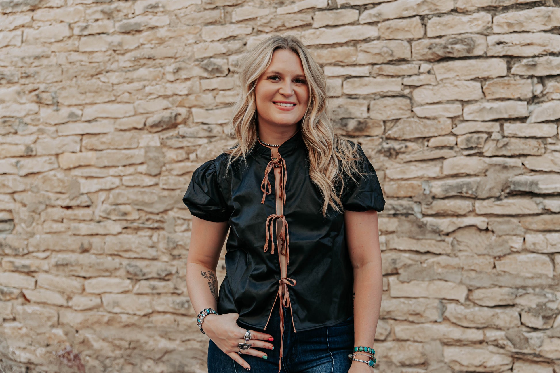 Stay chic and stylish with our Midnight Calhoun Top. Made with a black short sleeve design, this top features brown ties that can be styled into bows for a versatile look. The perfect addition to your wardrobe, add this top for a touch of elegance to any outfit