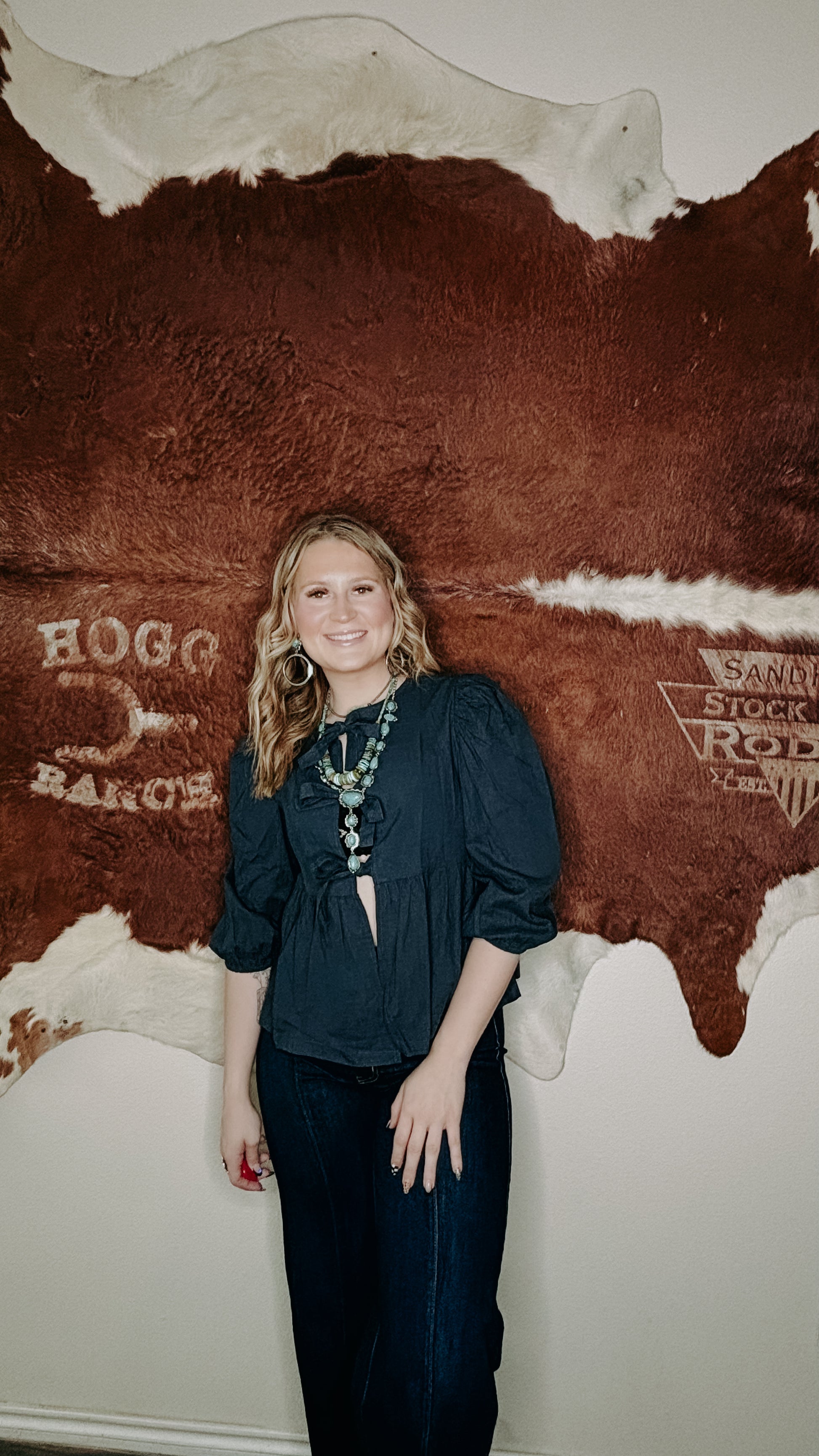 This 3/4 sleeve woven navy blue blouse top features a stylish front bow tie, adding a touch of elegance to your look. Made with high-quality fabric, it offers comfort and versatility, making it a perfect choice for both casual and formal occasions. Stay fashionable with this NAVY BOW TIE SHIRT.